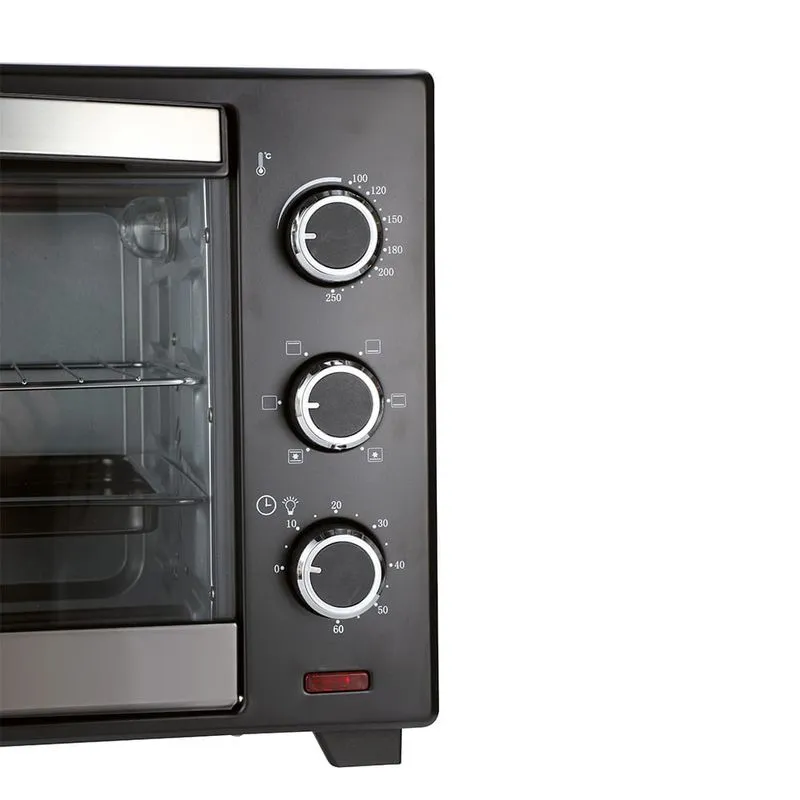 Podrás ajustar la temperatura entre 100°C y 250°C y programar el temporizador hasta por 60 minutos. Sus dimensiones son Al 41cm x Lo 62cm x Pr 40cm y tiene un peso de 11kg.