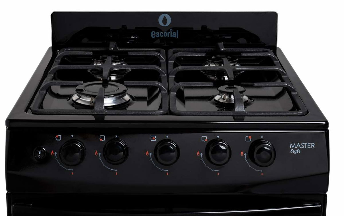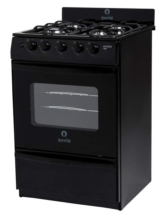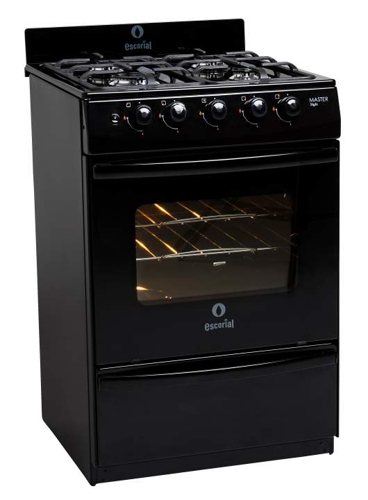 Negra con laterales del mismo color y tapa de horno de vidrio negro.