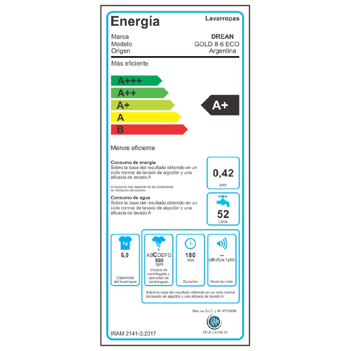 Lavarropas de Carga Superior. Su capacidad de lavado es de 6 Kg y su velocidad de centrifugado es regulable hasta 800 RPM. Color Blanco. Eficiencia energética A+. Sistema de lavado Europeo. Cuenta con Display LED y perilla bidireccional. Posee carga autoadaptativa, función autobalance y bloqueo de puerta. Incluye selector de temperatura y exclusión de centrifugado. Tambor de acero inoxidable. Sus programas incluyen lavado rápido 30’, eco wash y plancha fácil. Origen Argentina.