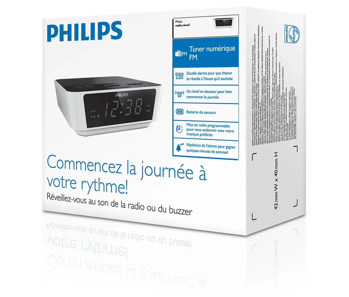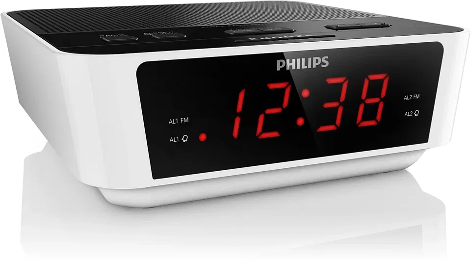 Para que no te quedes dormido, el radio reloj de Philips te ofrece la función de repetición de alarma. Si la alarma suena y aún no quieres levantarte, simplemente pulsa el botón de repetición una vez, vuelve a dormirte y en cinco minutos la alarma volverá a sonar. Puedes pulsar el botón de repetición cada nueve minutos hasta que la apagues por completo.