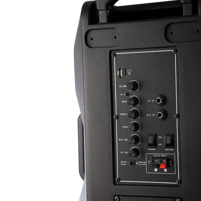 Conectores de entrada USB/TF Card/Aux in/Mic in/GT in/ DC 5v-2A/DC12v
