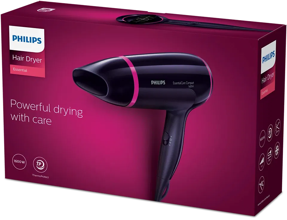 El secador de pelo Philips Essential te ofrece un secado potente de 1600 W y, al mismo tiempo, cuida tu cabello con el ajuste de temperatura ThermoProtect. Es fácil de usar gracias a los 3 ajustes de calor y velocidad, y chorro de aire frío.