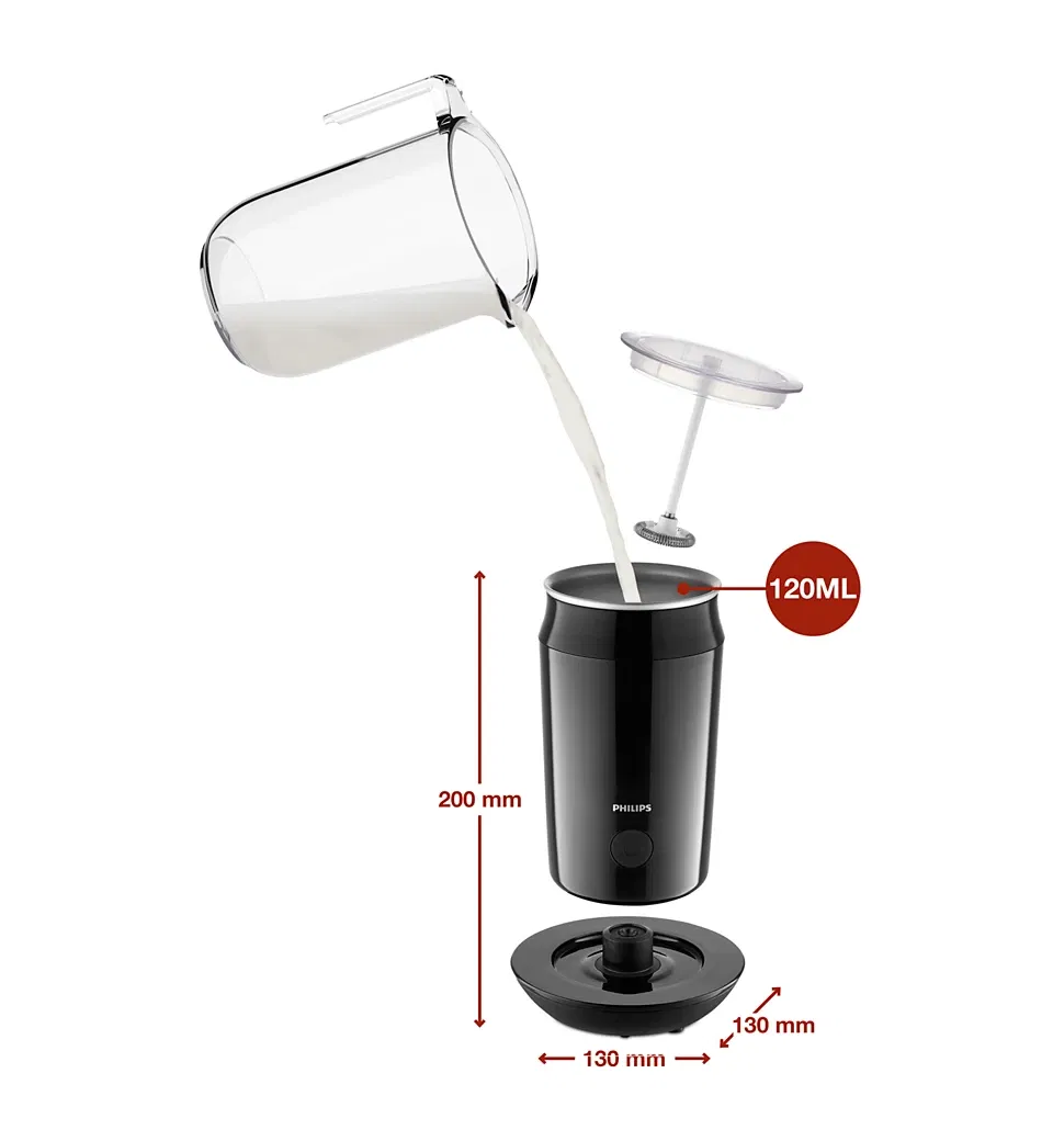 El espumador de leche de Philips ofrece la libertad de disfrutar de una variedad de recetas para café caliente y frío en casa. Gracias a su innovador regulador de espuma, puedes enriquecer un sabroso café con leche agregándole una espuma de leche increíblemente suave.
