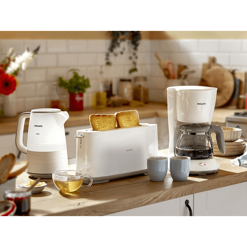 Tostadora con ranura larga y ocho ajustes para obtener un dorado uniforme sin importar lo que tueste o cómo le guste. Cuenta con una rejilla para calentar panecillos que se adapta a lo que sea, desde rollos hasta medialunas.