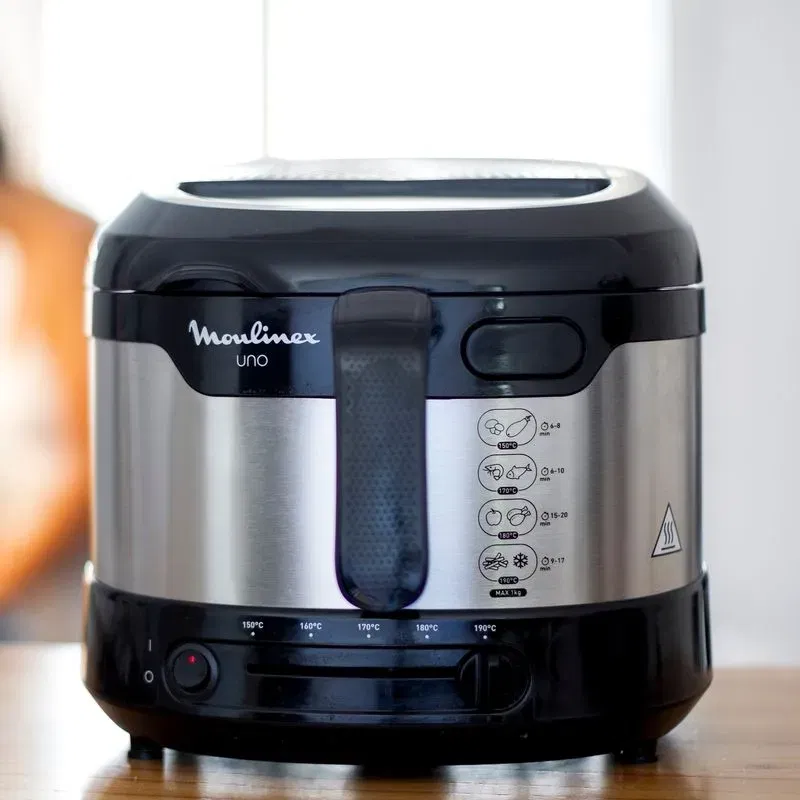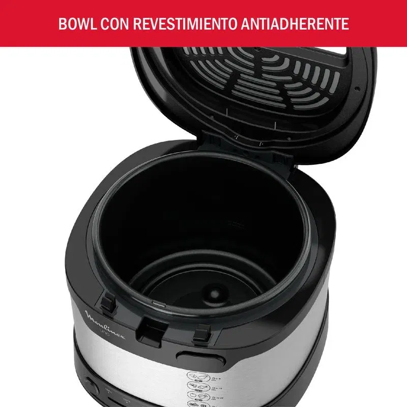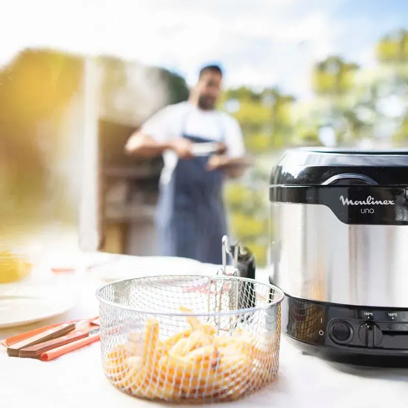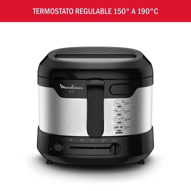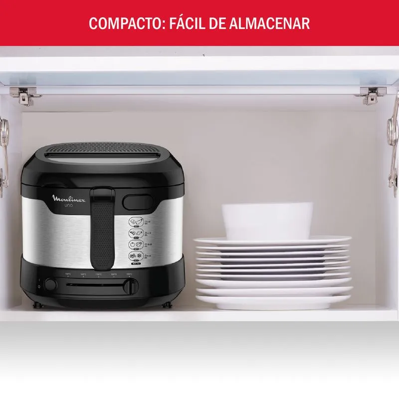 Freidora Uno M Inox Moulinex AF215D58: Nuestra freidora automática, hace papas deliciosas muy fácil. Cuenta con Bowl Antiadherente y una capacidad de Comida de 1 kg y 1,8 litros de aceite